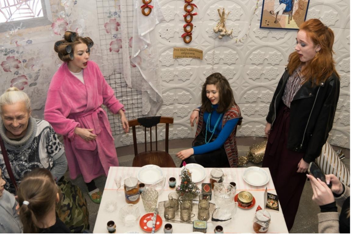 Пять ярких образов, пять персонажей и детальная проработка реплик. Коммунальная квартира: в прихожей сидит непослушная дочь-подросток, громко слушает музыку и надувает пузыри из жвачки. Выше, в гостиной ворчит отец, смотрит телевизор и пьет облепиховый морс. На кухне мама с завитыми бигудями хлопочет, готовит блюда из советской утвари, а в детской комнате младшая дочь-пионер развешивает памятные значки и наряжает кукол. В гараже, последней выставочной зоне, дед-журналист в отставке чинит свою «ласточку» и учит жизни посетителей и даже экскурсоводов!
