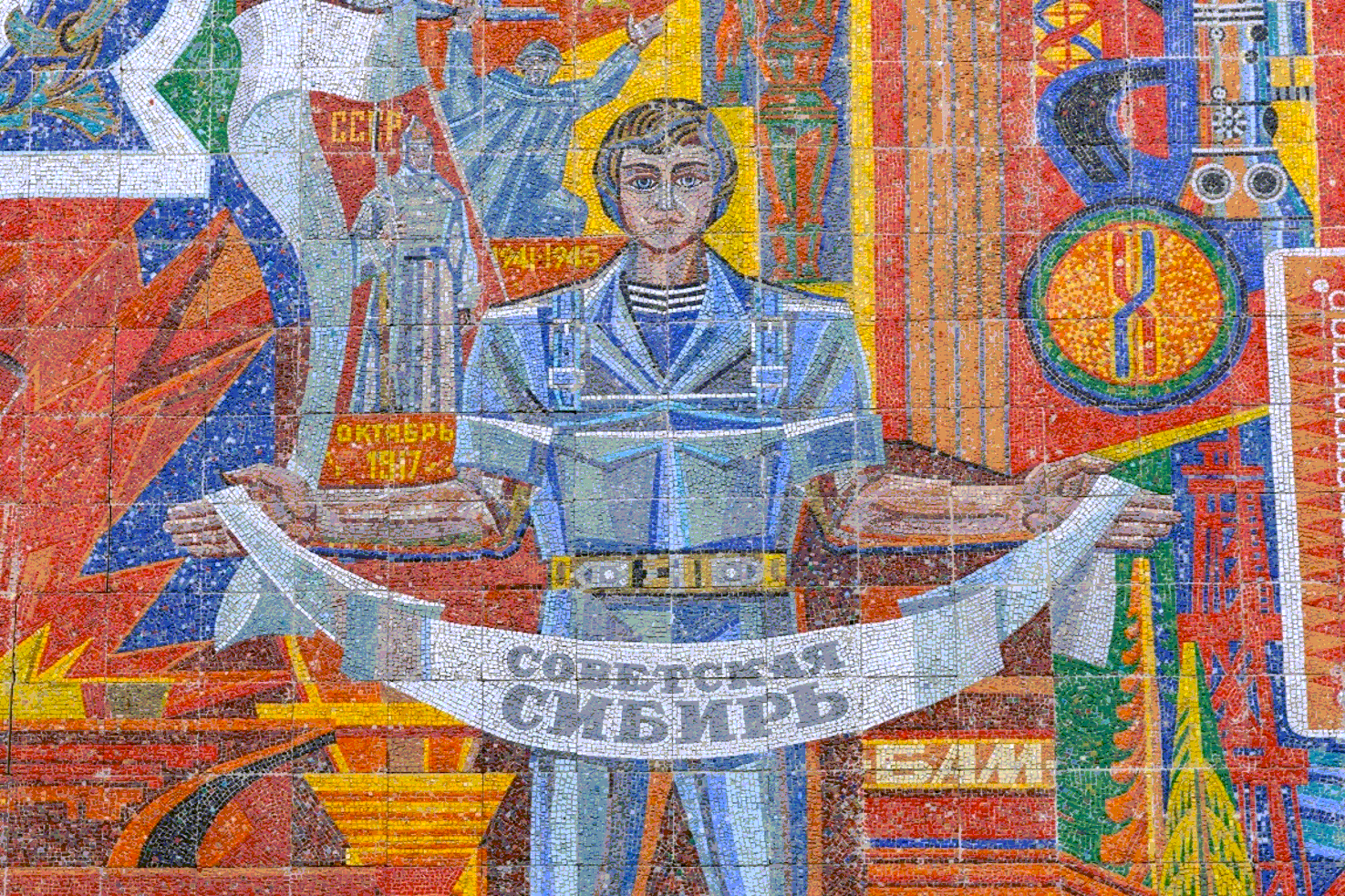 На левом берегу также находится восстановленное по мотивам оригинала мозаичное панно «Покорители Оби» работы новосибирского художника-монументалиста Владимира Сокола. Оно посвящено строителям Новосибирской ГЭС.